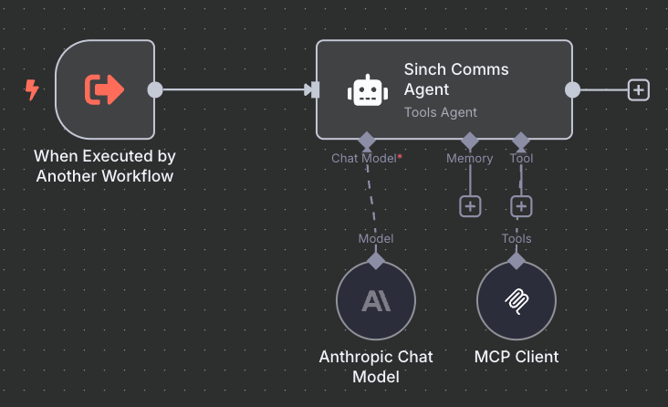 If you use AI workflow automation platform like n8n, you can use the Sinch MCP servers to add powerful communication tools to your workflow. These tools will be seamlessly understood by n8n and can be readily used by existing and new workflows with minimal overhead: